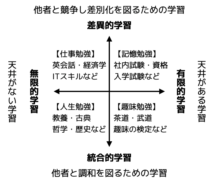 このマトリクスだと、僕は左側の「無限的学習」は好きですが、右側の「有限的学習」はあまり得意ではなく、あまりやってこなかったことに気が付きます。