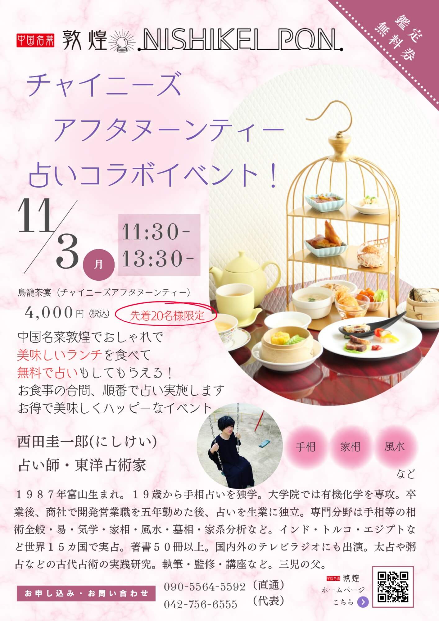 今回は敦煌さまのコラボでチャイニーズアフタヌーンティー(4,200円)をご注文いただいた方に先着20名で鑑定をさせていただきます。